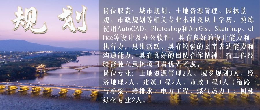 崗位專業(yè):土地資源管理2人、城鄉(xiāng)規(guī)劃3人、經(jīng)濟(jì)地理2人、建筑工程2人、市政工程4人、園林綠化專業(yè)2人。