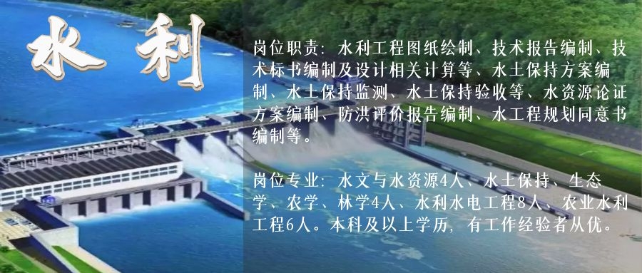 崗位職責(zé):水利工程圖紙繪制、技術(shù)報告編制、技術(shù)標(biāo)書編制及設(shè)計相關(guān)計算等、水土保持方案編制、水土保持監(jiān)測、水土保持驗收等、水資源論證方案編制、防洪評價報告編制、水工程規(guī)劃同意書編制等。崗位專業(yè):水文與水資源4人、水土保持、生態(tài)學(xué)、農(nóng)學(xué)、林學(xué)4人、水利水電工程8人、農(nóng)業(yè)水利工程6人。本科及以上學(xué)歷,有工作經(jīng)驗者優(yōu)先。